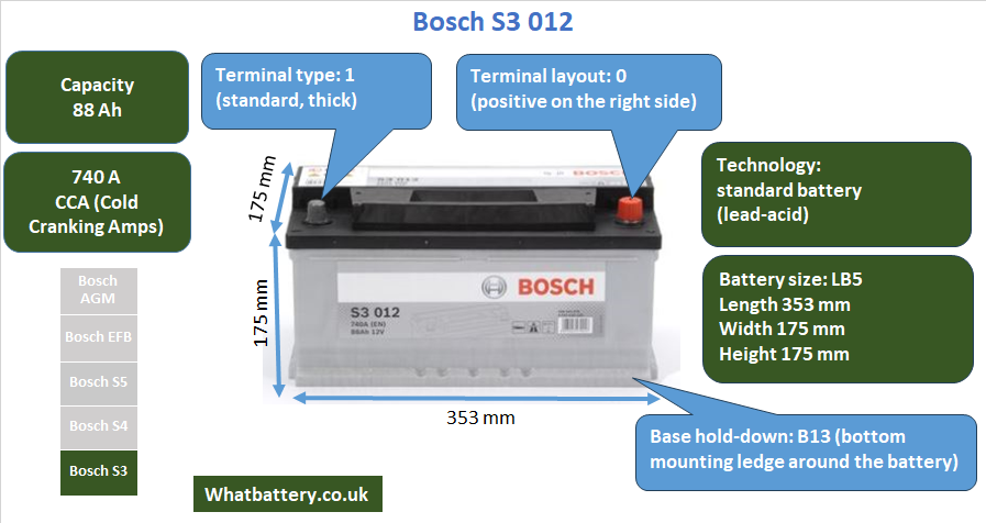 The Bosch S30 12 model is one of the highest-capacity batteries in the S3 series, offering 88 Ah capacity and a maximum starting current of 740 A. These specifications make it well-suited for larger passenger cars and light commercial vehicles that require higher power for starting and running electrical systems. Its dimensions (353x175x175 mm) place it in the standard L5 European size category, ensuring compatibility with a wide range of vehicle models. The reduced height of 175 mm allows it to fit vehicles with limited engine compartment space.