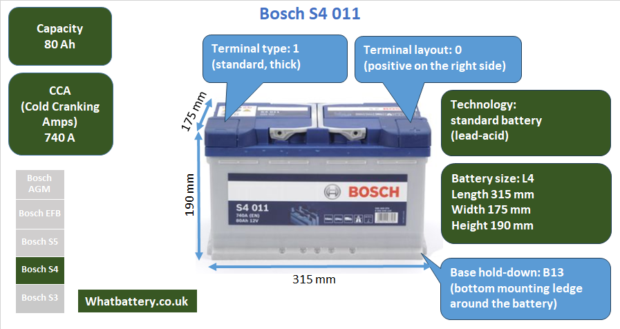 If you are looking for a battery with similar specifications, consider other models with comparable features. Alternatives include the Bosch S50 11 from the S5 series, which offers a slightly higher capacity (85 Ah) and a greater starting current (800 A). Other equivalents are the Exide EB800 (80 Ah, 640 A), Exide EA900 (90 Ah, 720 A), Varta Blue Dynamic F16 (80 Ah, 740 A), and Varta Silver Dynamic F19 (85 Ah, 800 A). All these batteries have identical dimensions (315x175x190 mm) and fit the same mounting systems.