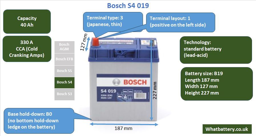 For those looking for a battery with similar specifications, alternatives include the Exide Excell EB357 (35 Ah, 240 A), Lucas Premium LP055 (40 Ah, 360 A), and Varta Blue Dynamic A15 (40 Ah, 330 A). All these models have identical dimensions (187x127x220-227 mm), layout 1, and thin type 3 terminals, making them suitable replacements for the Bosch S40 19.