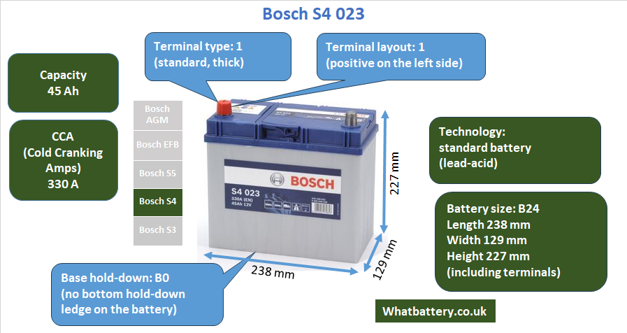 In conclusion, the Bosch S40 23 is a compact, efficient, and dependable battery ideal for smaller vehicles with modest power demands. Its specific configuration—especially the terminal layout and B0 mounting type—makes it well-suited for certain imports or older models with less conventional designs. It may not have the high-end output of larger batteries, but for vehicles that require this particular size and layout, the S40 23 offers excellent reliability and performance from a brand with decades of proven expertise.