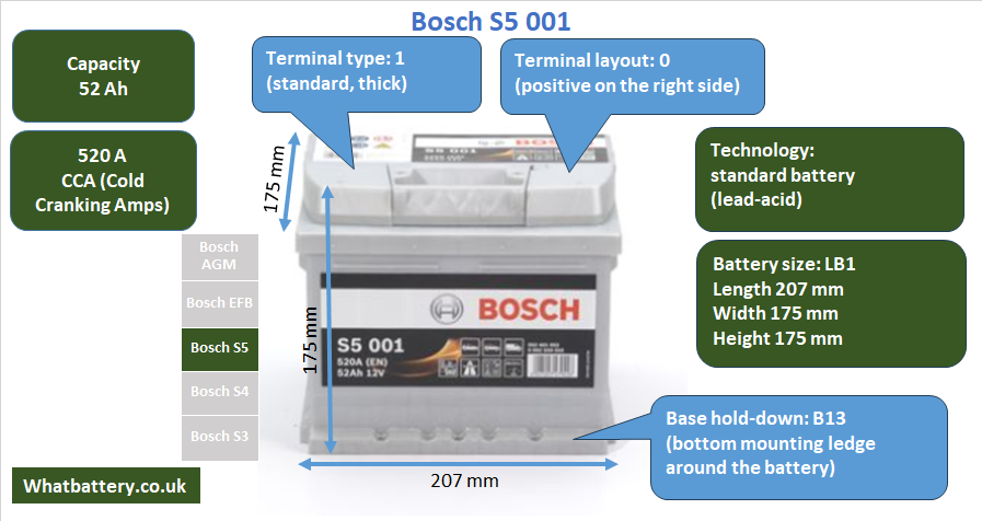 The Bosch S50 01 is a compact yet powerful battery in the S5 range, with a capacity of 52 Ah and a cold cranking current of 520 A. It is a traditional flooded (wet-cell) lead-acid battery and is fully maintenance-free under normal operating conditions. With a footprint of 207 mm in length, 175 mm in width, and a height of only 175 mm, the battery is slightly lower than the standard European height of 190 mm. This makes it especially well-suited for vehicles that require a lower-profile battery due to space constraints under the hood. Based on its dimensions, it corresponds most closely to the LB1 (207x175x175 mm) group size, a common standard in compact European cars.