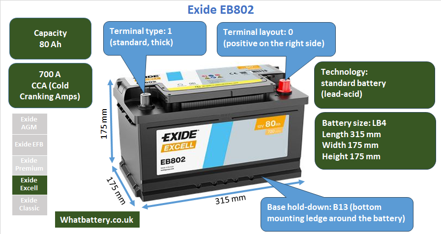 | Exide Excell EB802 | 80 Ah | 700 A | 315x175x175 mm | B13 |