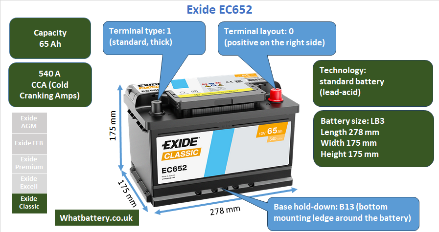 The Exide Classic EC652 is a 65 Ah battery with a 540 A cranking current, making it well-suited for mid-sized passenger cars and some light commercial vehicles. With dimensions of 278x175x175 mm, it falls under the H6/LB3 standard size, meaning it is compatible with many popular Volkswagen, Opel, Ford, and other European vehicles.