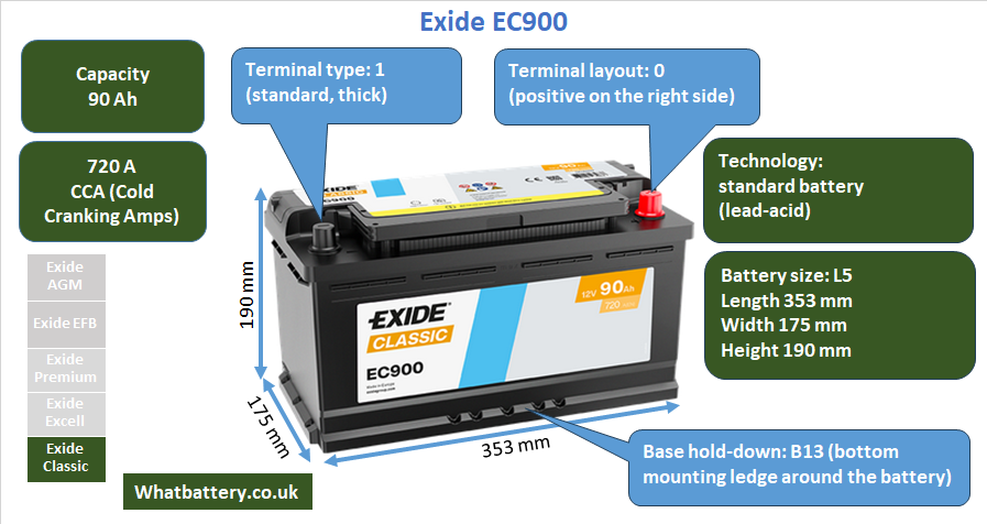 The Exide Classic EC900 is a 90 Ah battery with a cranking power of 720 A, making it an ideal choice for larger passenger cars, SUVs, vans, and light commercial vehicles. Its dimensions of 353x175x190 mm classify it as a standard European L5 size, commonly found in vehicles that demand a higher energy capacity.