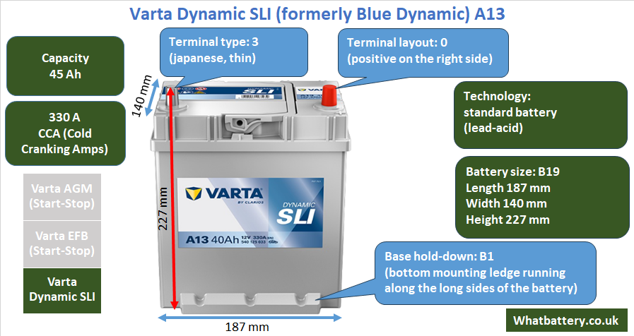 The A13 model from the Varta Blue Dynamic series is a lead-acid battery with a capacity of 40 Ah, designed for vehicles that require stability and a reliable engine start. A maximum cranking current of 330 A ensures a rapid engine start even at low temperatures, which is crucial for everyday operation, especially in challenging winter conditions. The dimensions of the A13 model are 187 mm in length, 140 mm in width, and 227 mm in height.